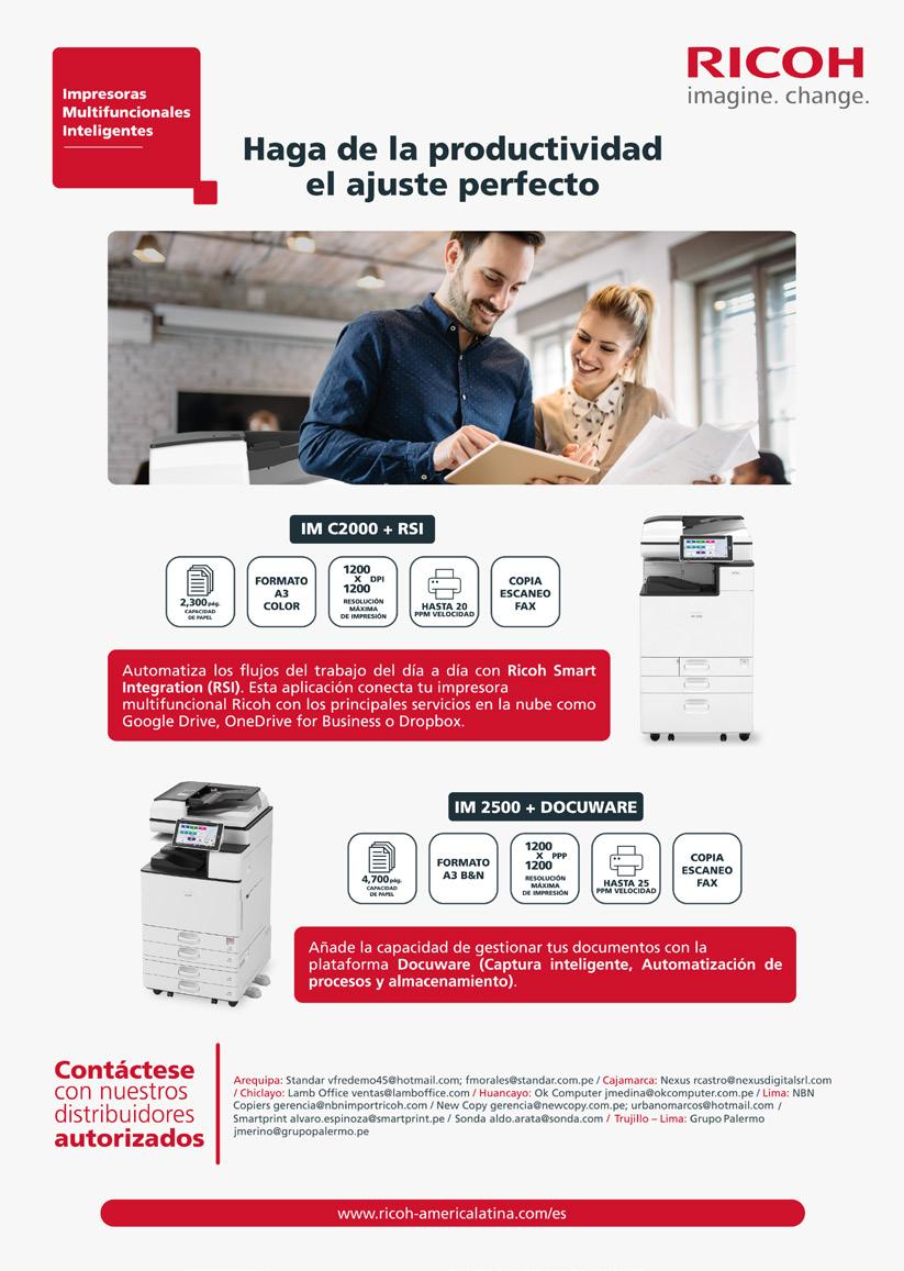 ¿Cuáles son sus estrategias para fortalecer la relación con el canal peruano y mayoristas? El canal indirecto es un pilar fundamental de Ricoh Perú. Tenemos la convicción de que la forma de crecer es de la mano de nuestros canales de distribución, quienes son nuestros socios de negocios. Junto a ellos buscamos llevar nuestra propuesta de valor a los clientes finales. Nuestra estrate gia para los canales consiste en aprovechar las fortalezas del negocio base, para hacer una expansión a un segmento de mercado al cual no podemos llegar directamente. Buscamos tener con nuestros canales una alianza fortalecida que los hace ser parte de Ricoh, capacitándolos constantemente tanto de forma técnica y comercial con la
