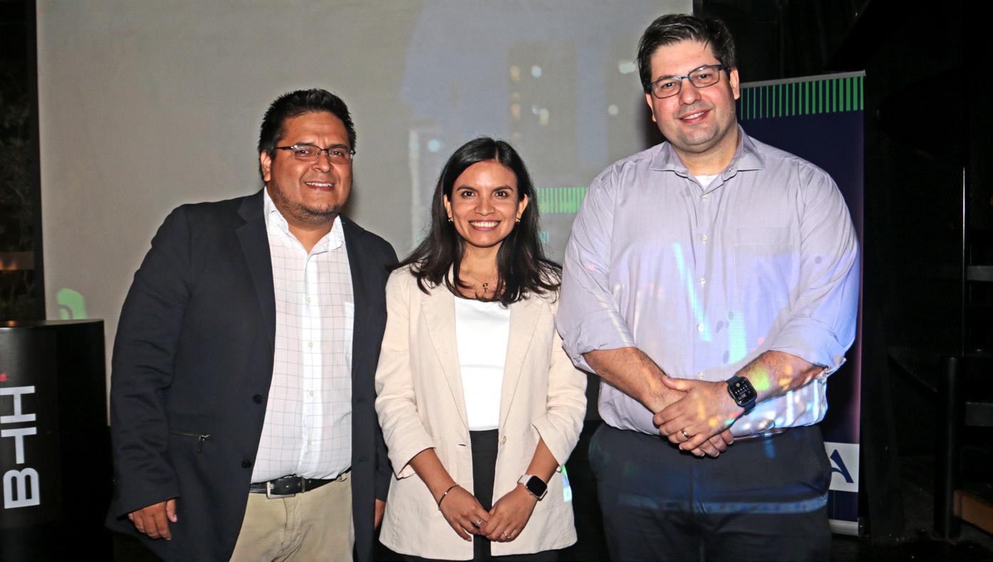 Carlos López, Product Sales Manager de Adistec; Lorena Gonzales, Business Sales Manager de Adistec; junto a Juliano Fortes, de Delinea.