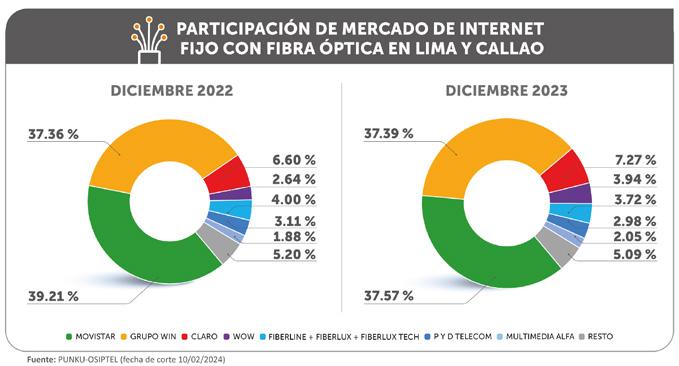 De acuerdo con el portal informativo Punku (https://punku. osiptel.gob.pe) del Osiptel, Movistar lideró la participación de mercado de fibra óptica en Lima y Callao con 37.57 %, seguida por el Grupo Win con 37.39 %, la diferencia entre ambas empresas es de 2048 conexiones.