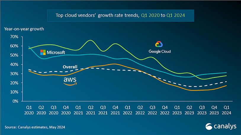 Los tres hiperescaladores experimentaron un aumento de la tasa de crecimiento, a medida que se aceleró el gasto en la nube empresarial. Sin embargo, Microsoft superó tanto a AWS como a Google Cloud, con un impresionante aumento de las ventas del 31% interanual, casi el doble de la tasa de crecimiento de AWS del 17%, mientras que Google Cloud creció un 28% interanual. A pesar de tener la mayor cuota de mercado, AWS se enfrenta a una competencia cada vez mayor de sus competidores de rápido crecimiento. En mayo de 2024, la compañía anunció la salida del CEO Adam Selipsky después de tres años en el cargo.