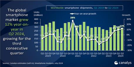 Según la última investigación de Canalys, el mercado mundial de teléfonos inteligentes alcanzó la racha de crecimiento interanual del tercer trimestre, con una expansión de envíos del 12% en el segundo trimestre de 2024, alcanzando 288 millones de unidades. Samsung siguió siendo el líder mundial con una participación de mercado del 18% mientras renovaba su énfasis en el mercado de alta gama como prioridad estratégica.