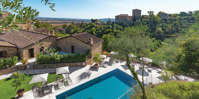 In the heart of the beautiful Sienese countryside, among rolling hills and timeless silence, Le Macine di Stigliano, an ancient medieval stronghold that has been skilfully renovated, is now a wonderful 4-star Relais. A unique oasis of peace, with ten elegant rooms that combine contemporary comfort and historical charm. The swimming pool and exclusive wellness centre in the olive grove are an authentic invitation to relax. Ideal for evocative biking adventures on ancient trails, it will give you the opportunity to complete your stay with the experience of superb cuisine to be enjoyed in a refined atmosphere: La Merla Osteria Boutique will delight you with the authentic flavours of revisited Tuscan tradition, enhanced by local products. An intimate and well-kept retreat, where history, wellness and exclusivity are the precious ingredients of a tailor-made holiday, designed to give you only beautiful and unforgettable memories.