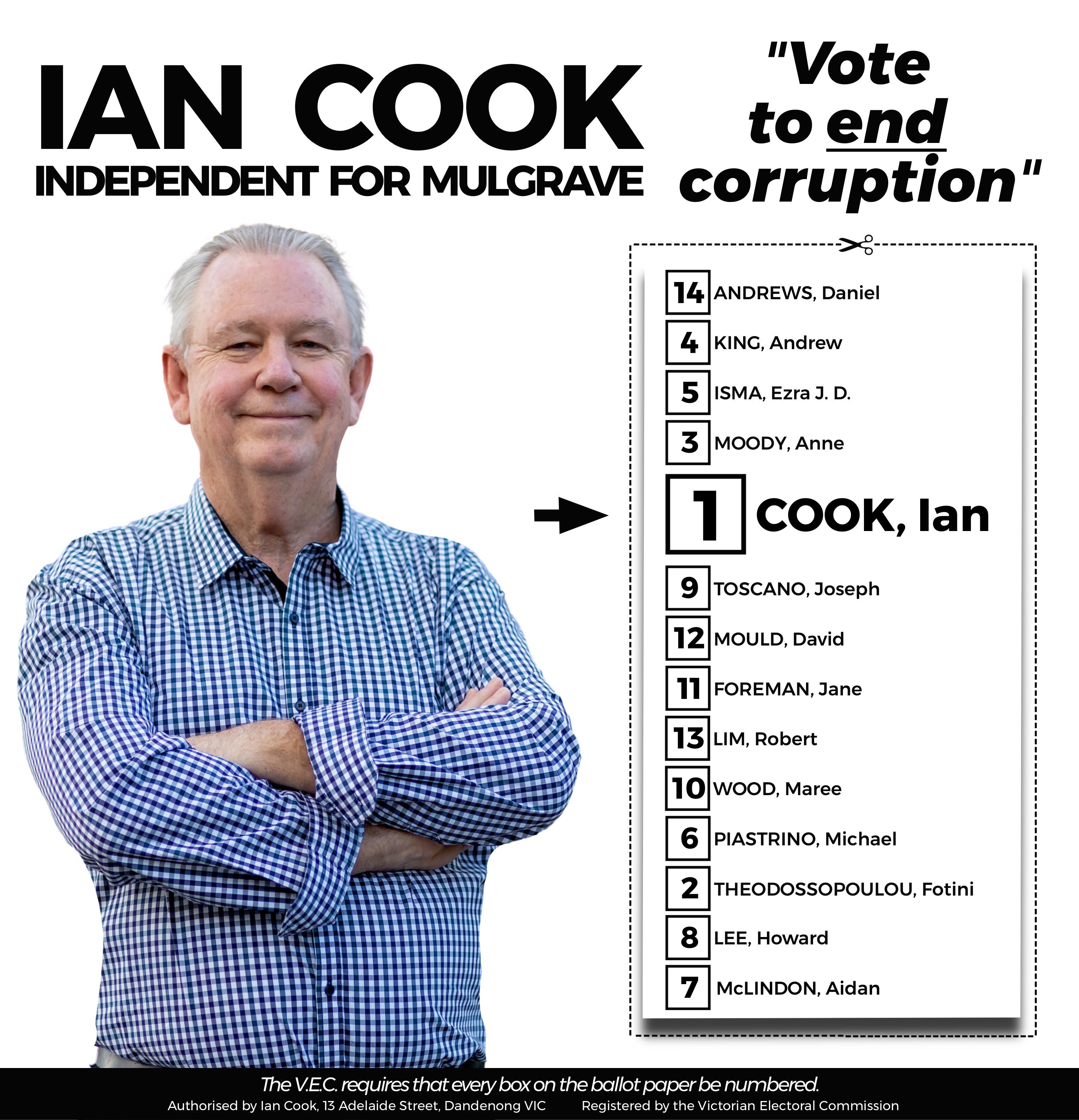 The field of 14 includes independent Ian Cook, known for his fight against Department of Health and Greater Dandenong Council for the closure of his business.