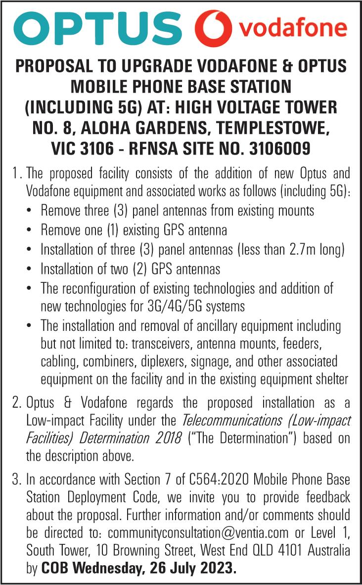 1. The proposed facility consists of the addition of new Optus and Vodafone equipment and associated works as follows (including 5G):