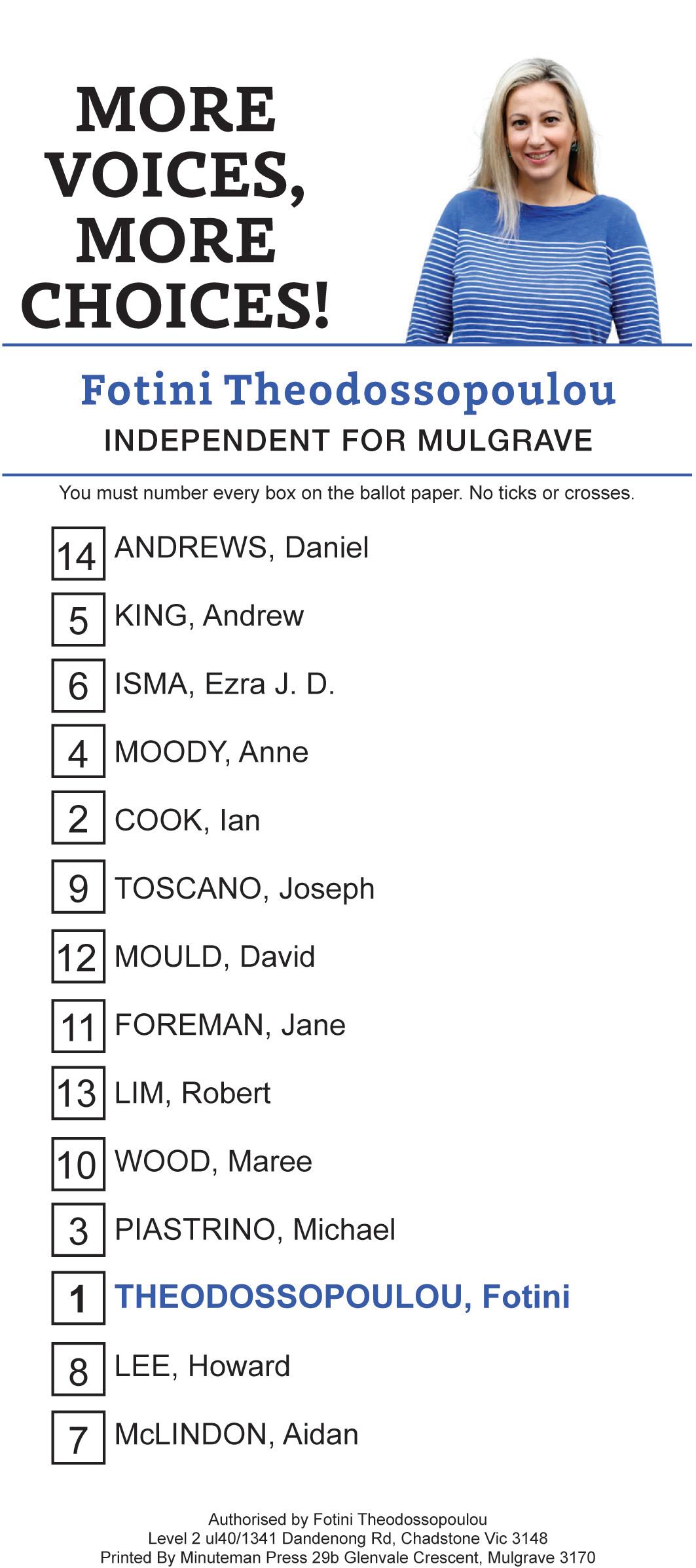 Other candidates are Andrew King, Ezra Isma, Anne Moody, Joseph Toscano, Howard Lee, David Mould (Animal Justice Party), Jan Freeman (Family First Victoria), Robert Lim (Australian Greens), Maree Wood (DLP), Michael Piastrino (Liberal)