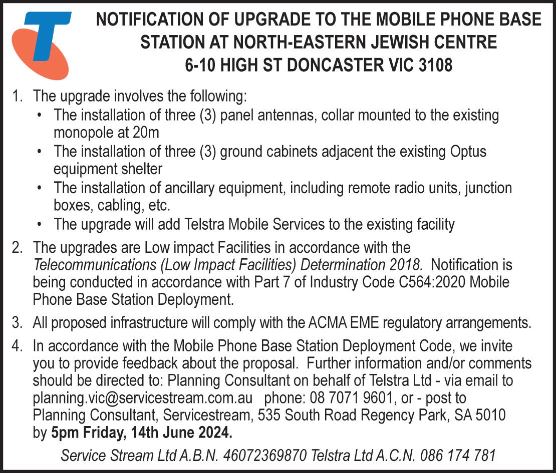 In accordance with Section 7 of C564:2020 Mobile Phone Base Station Deployment Code, we invite you to provide feedback about the proposals. Further information and/or comments should be directed to: Lynette Brandwood at 0429 392 255, or via email at Optus.submissions@servicestream.com.au or Zenith Centre, Level 3, Tower B, 821 Pacific Highway, Chatswood NSW 2167, by 5pm, Monday 17 June 2024.