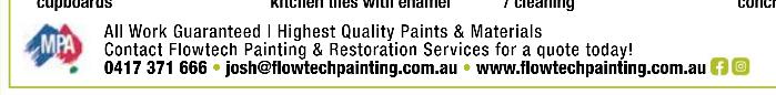 Shop • Interior/Exterior painting. • Stained timber conversions. • Refacing kitchen, bathroom and laundry cupboards. • Weatherbord homes. • Exterior transformations. • Bath/basin 2-pack. • Refacing old bathroom & kitchen tiles with enamel. • Roof restorations - Colorbond tin or tile. • Custom feature walls. • High pressure washing/cleaning. • Deck restorations and staining. • Fence painting. • Driveways, garage floors, concrete sealing and painting. 0435 788 758 0448 714 604