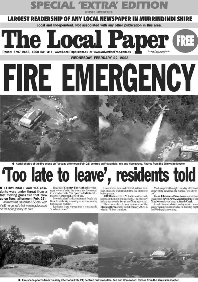 Paper WEDNESDAY, MARCH 8, 2023 Phone: 5797 2656, 1800 231 311. www.LocalPaper.com.au or www.AdvertiseFree.com.au FREE ‘The Local Paper’ is published by Local Media Pty Ltd Local and Independent. Not associated with any other publication in this area. LARGEST READERSHIP OF ANY LOCAL NEWSPAPER IN MURRINDINDI SHIRE Yea Newsagency 74 High St, Yea Phone: 5797 2196 Tattslotto, Oz Lotto, Powerball and more Buy yo ur ticket at Yea Newsagency ● ● Toys ● ● Inkjet ● ● ● ● ● Greeting Cards ● ● ● ● Stationery ● ● ● ● Office Needs ● ● ● ● Magazines ● ● ● ● Newspapers ● ● ● ● Lotto $4 MIL. POWERBALL THU., MAR. 9 ● ● Local Paper special edition on Febrary 22. See LocalPaper.com.au GREENSBOROUGH, YARRAMBAT, PLENTY CR RICHARD STOCKMAN Nillumbik Shire Blue Lake Ward Councillor Phone 0438 143 678 richard.stockman@nillumbik.vic.gov.au