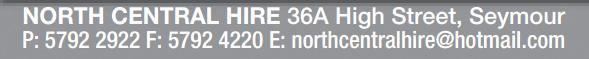 www.LocalPaper.com.au The Local Paper - Wednesday, May 10, 2023 - Page 53 www.northcentralhire.com.au NORTH CENTRAL HIRE 4/145 Wimble St, Seymour P: 5792 2922 F: 5792 4220 E: northcentralhire@hotmail.com