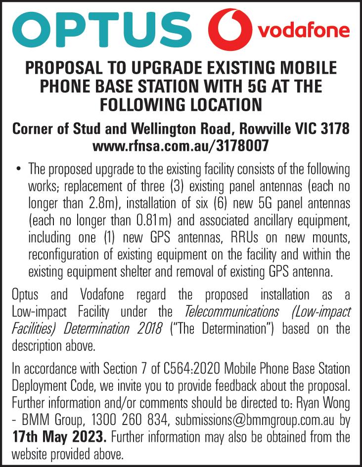 3. In accordance with Section 7 of C564:2020 Mobile Phone Base Station Deployment Code, we invite you to provide feedback about the proposal. Further information and/or comments should be directed to Ventia.