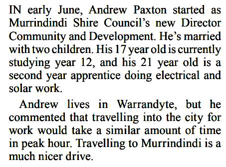 Ms Bonazzi also seemed to be critical that The Local Paper was to publish that the Council’s new executive, Andrew Paxton, did not live in the Murrindindi area, and in fact lived in the Melbourne suburb of Warrandyte.