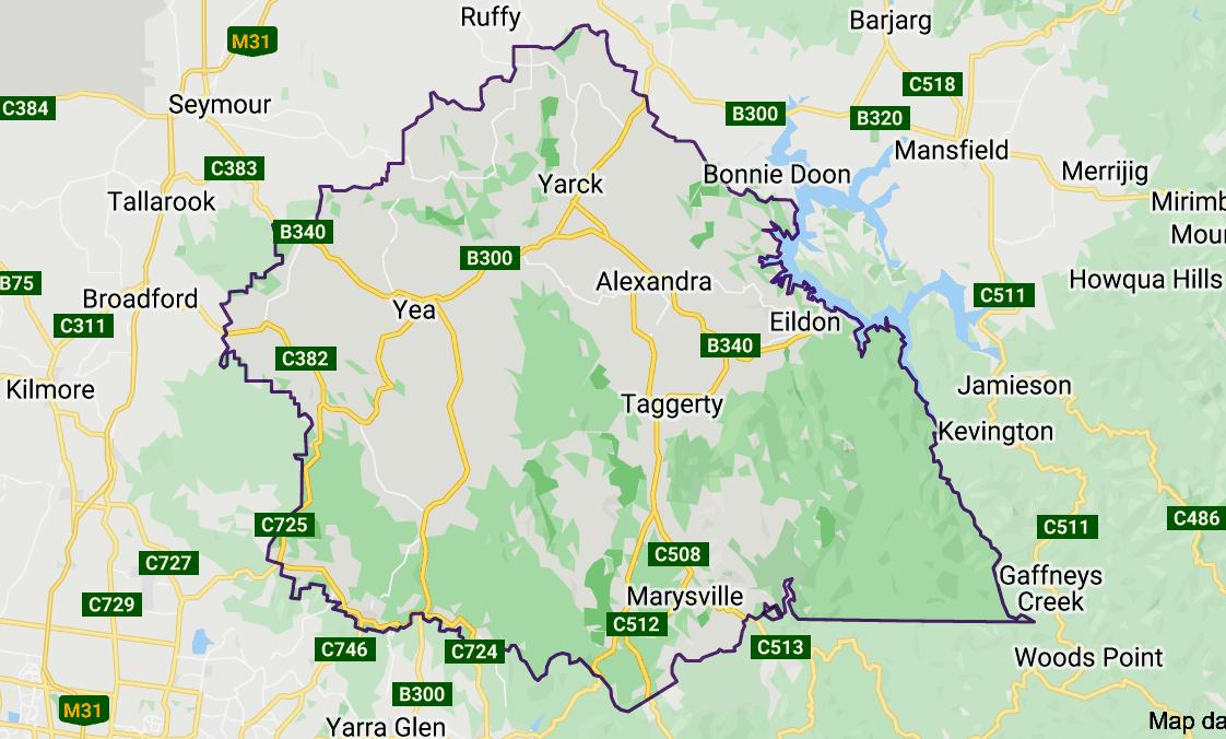 Murrindindi comprises Acheron, Alexandra, Buxton, Cathkin, Castella, Caveat, Devils River, Dropmore, Eildon, Fawcett, Flowerdale, Ghin Ghin, Glenburn, Gobur, Granton, Highlands, Homewood, Kanumbra, Kerrisdale, Killingworth, Kinglake, Kinglake Central, Kinglake West, Koriella, Limestone, Maintongoon, Marysville, Molesworth, Murrindindi, Narbethong, Pheasant Creek, Rubicon, Strath Creek, Taggerty, Taylor Bay, Terip Terip, Thornton, Toolangi, Whanregarwen, Yarck, Yea. Also to Mansfield. Murrindindi Shire is home to more than 14,478 people, living in approximately 6293 homes.