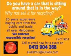 www.LocalPaper.com.au The Local Paper - Wednesday, October 26, 2022 - Page 49 Classifieds 9489 2222 Phone: 9489 2222 or 1800 231 311. Web: www.LocalPaper.com.au E-Mail: editor@LocalPaper.com.au Deadline: 5pm Friday Local PAID ADS appear in localised editions of The Local Paper in 40 local government areas across Victoria, plus the Melbourne Observer newspaper. All ads appear in print, and also in the Digital Editions at no additional charge. LINE ADS: $20 for first 20 words, then $1 per word. DISPLAY ADS: $20 per single column centimetre. SAMPLE PRICES: 1/16th page (9cm x 2 col): $360. 1/8th page (18cm x 2 col): $720. 1/4th page (18cm x 4 col): $1440. Half-Page (18cm x 8 col): $2880. Full-Page (37cm x 8 col): $5920. TERMS AND CONDITIONS: All ads are pre-paid by Card (V, M and AE) or EFT (033091 260131). See our Terms and Conditions at www.LocalPaper.com.au Phone PUBLIC NOTICES PUBLIC NOTICES WANTED Datsun Skyline 1973 to 1995. 240K, C210, R30, 280ZX, whole or parts. Any Condition. Pay $$$ 0422 076 298 Star Tree Services QUALIFIED ARBORISTS • Tree Removal • Tree Surgery & Pruning • Consultations & Reports • Elm Leaf Beetle Control • Mulch & Firewood Sales 5783 3170 Free Quotes. Full Insurance Cover www.treeservices.com.au mail@treeservices.com.au gpy,, www.LocalPaper.com.au Lodge your free ad, anytime 24/7 at the ‘Free Ads’ section at www.AdvertiseFree. com.au