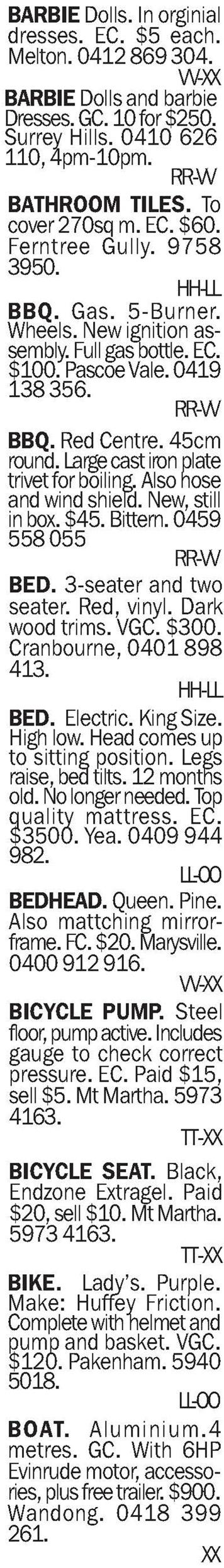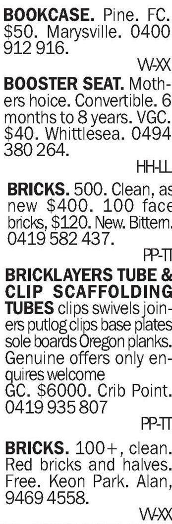 holiday home or unit. Very clean. EC. $100. Marysville. 0417 337 424.F-I DINING CHAIRS. Eight, leather. Frames, EC. Some chairs need recovering. Chocolate brown leather. $100 lot. FC. Assorted prices. Marysville. 0417