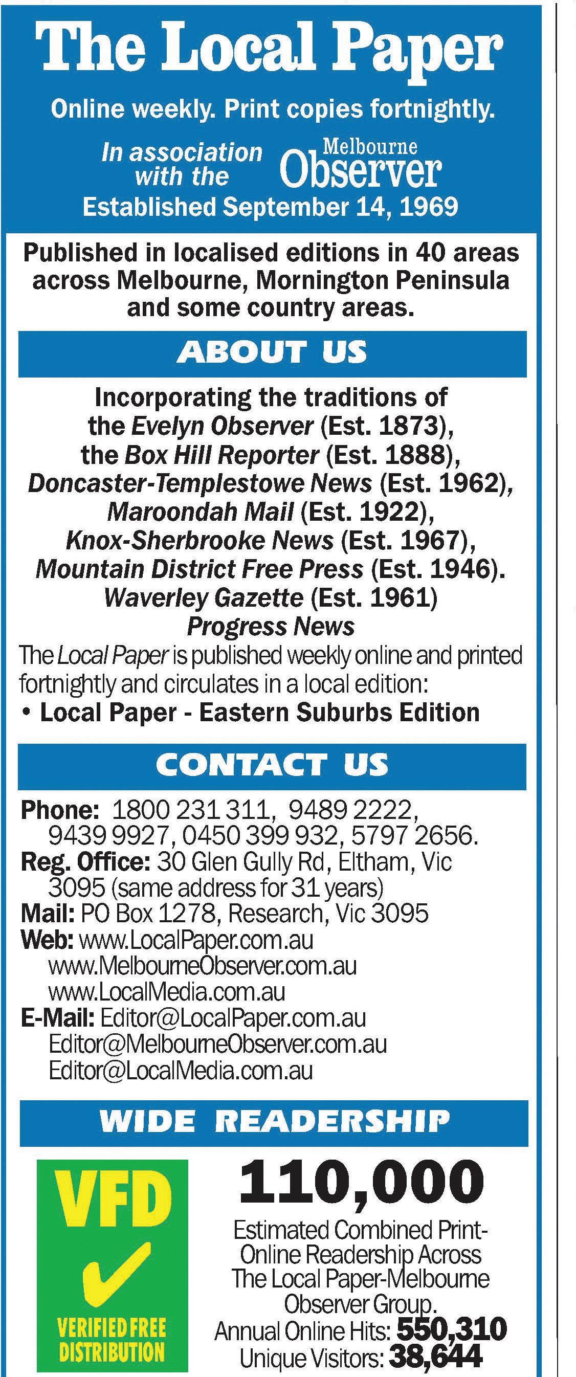 The Local Paper has a network of local editions - in print and online - that serve local communities including Banyule, Bayside, Boroondara, Brimbank, Cardinia, Casey, Darebin, Frankston, Glen Eira, Greater Dandenong, Hobsons Bay, Hume, Kingston, Knox, Manningham, Mansfield, Maribyrnong, Maroondah, Melbourne, Melton, Merri-bek, Mitchell, Monash, Moonee Valley, Moorabool, Mornington Peninsula, Murrindindi, Nillumbik, Port Phillip, Stonnington, Strathbogie, Whitehorse, Whittlesea, Yarra and Yarra Ranges.