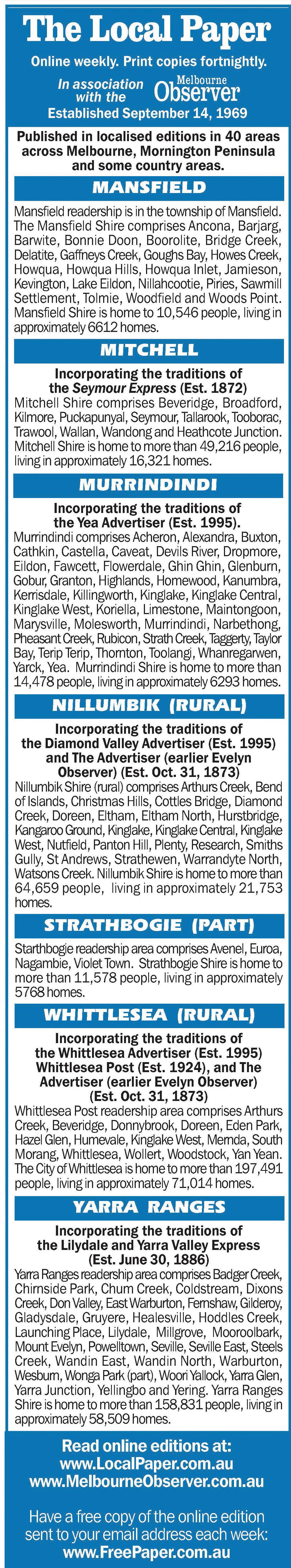 Eastern Suburbs Edition. Boroondara (north), Knox-Sherbrooke, Manningham, Maroondah, Monash, Whitehorse. Lilydale and Yarra Valley Express Edition. Healesville, Lilydale, Mount Evelyn, Warburton. Mitchell Strathbogie Edition. Avenel, Beveridge, Broadford, Euroa, Kilmore, Longwood, Nagambie, Seymour, Violet Town, Wallan, Wandong-Heathcote Junction. North-West Edition. Brimbank, Hobsons Bay, Hume, Maribyrnong, Melton, Merri-bek, Moonee Valley, Moorabool, Wyndham. Northern Suburbs Edition. Banyule, Darebin (north - Preston, Reservoir), Darebin (south - Northcote, Thornbury), Nillumbik (urban), Whittlesea (urban). Regional Edition. Mansfield, Murrindindi (Alexandra, Kinglake, Yea), Nillumbik (rural), Whittlesea (rural). Southern Cross Weekly Edition. Bayside, Boroondara (south), Glen Eira, Kingston, Melbourne, Port Phillip, Stonnington, Yarra. South-East. Cardinia, Casey, Frankston, Greater Dandenong, Mornington Peninsula.