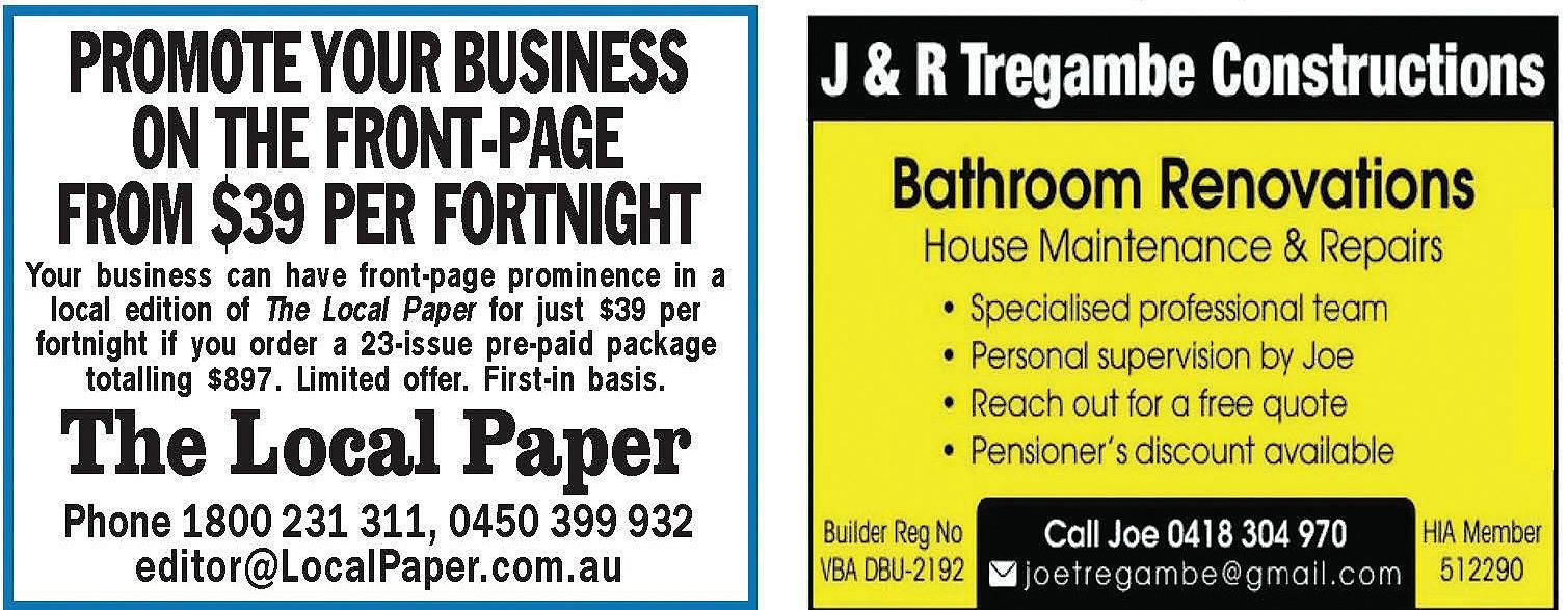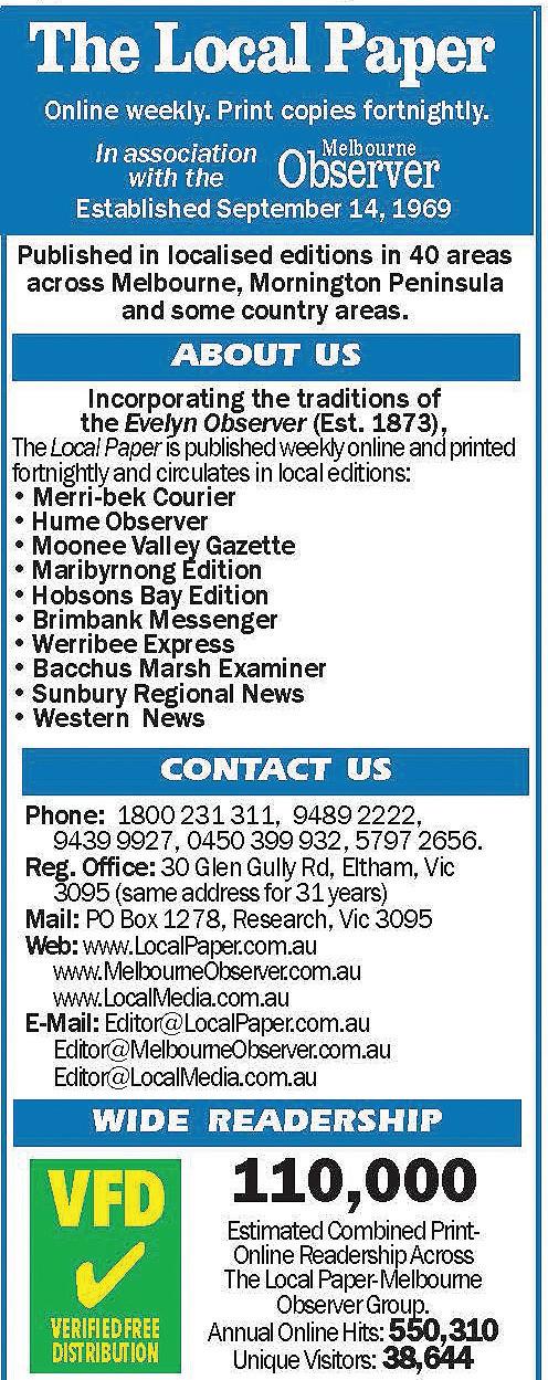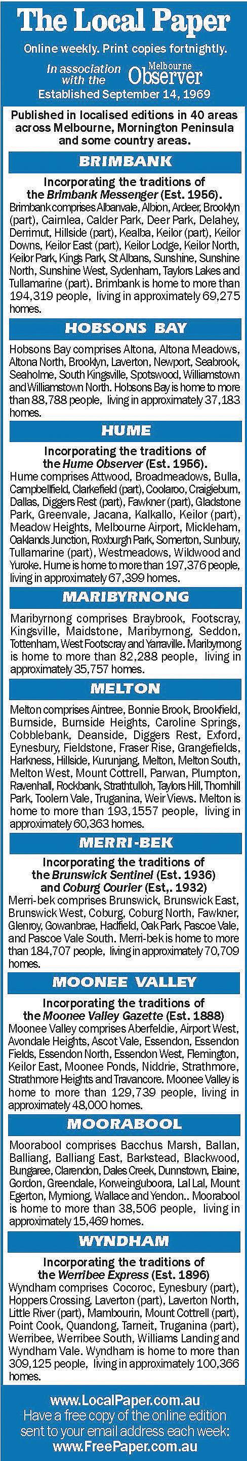 The Local Paper has a network of local editions - in print and online - that serve local communities including Banyule, Bayside, Boroondara, Brimbank, Cardinia, Casey, Darebin, Frankston, Glen Eira, Greater Dandenong, Hobsons Bay, Hume, Kingston, Knox, Manningham, Mansfield, Maribyrnong, Maroondah, Melbourne, Melton, Merri-bek, Mitchell, Monash, Moonee Valley, Moorabool, Mornington Peninsula, Murrindindi, Nillumbik, Port Phillip, Stonnington, Strathbogie, Whitehorse, Whittlesea, Yarra and Yarra Ranges.