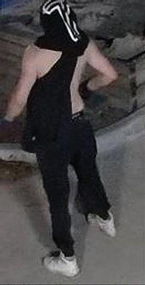 Male two is described as Caucasian in appearance, wearing a black hoodie with white text on the back, black shorts and black and white TN Nike shoes.