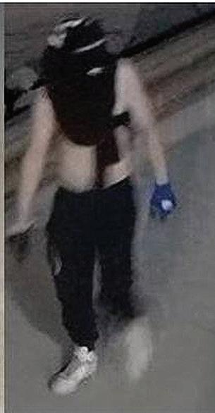 Male three is described as Caucasian in appearance, wearing a grey hoodie, blue gloves, light blue pants and black running shoes.