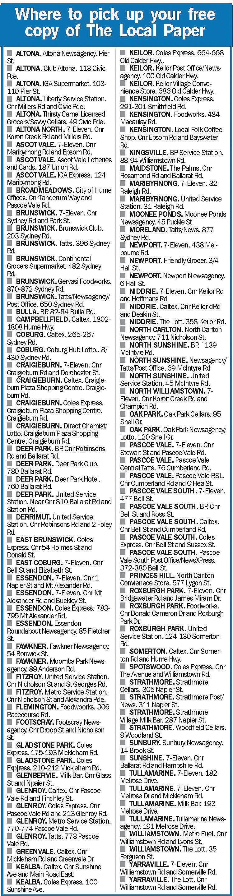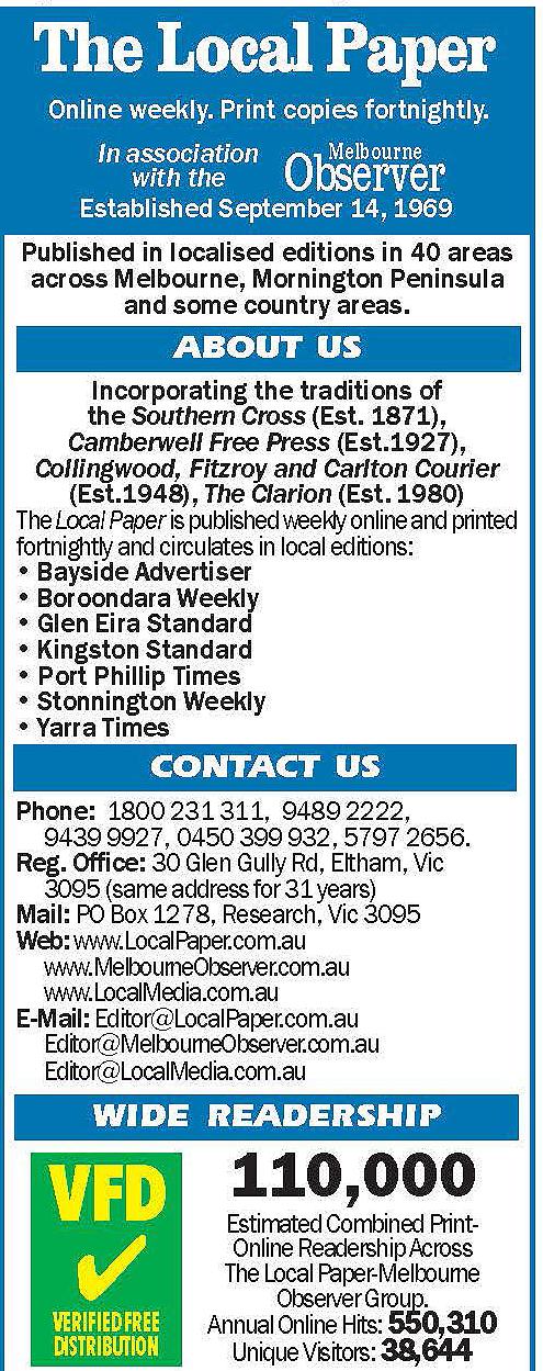 The Local Paper has a network of local editions - in print and online - that serve local communities including Banyule, Bayside, Boroondara, Brimbank, Cardinia, Casey, Darebin, Frankston, Glen Eira, Greater Dandenong, Hobsons Bay, Hume, Kingston, Knox, Manningham, Mansfield, Maribyrnong, Maroondah, Melbourne, Melton, Merri-bek, Mitchell, Monash, Moonee Valley, Moorabool, Mornington Peninsula, Murrindindi, Nillumbik, Port Phillip, Stonnington, Strathbogie, Whitehorse, Whittlesea, Yarra and Yarra Ranges.