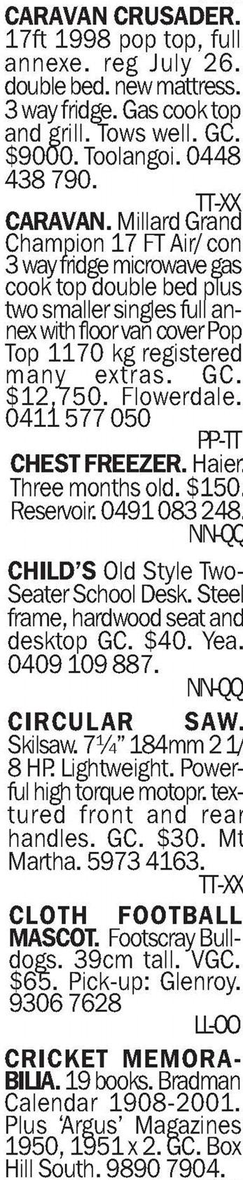 holiday home or unit. Very clean. EC. $100. Marysville. 0417 337 424.F-I DINING CHAIRS. Eight, leather. Frames, EC. Some chairs need recovering. Chocolate brown leather. $100 lot. FC. Assorted prices. Marysville. 0417