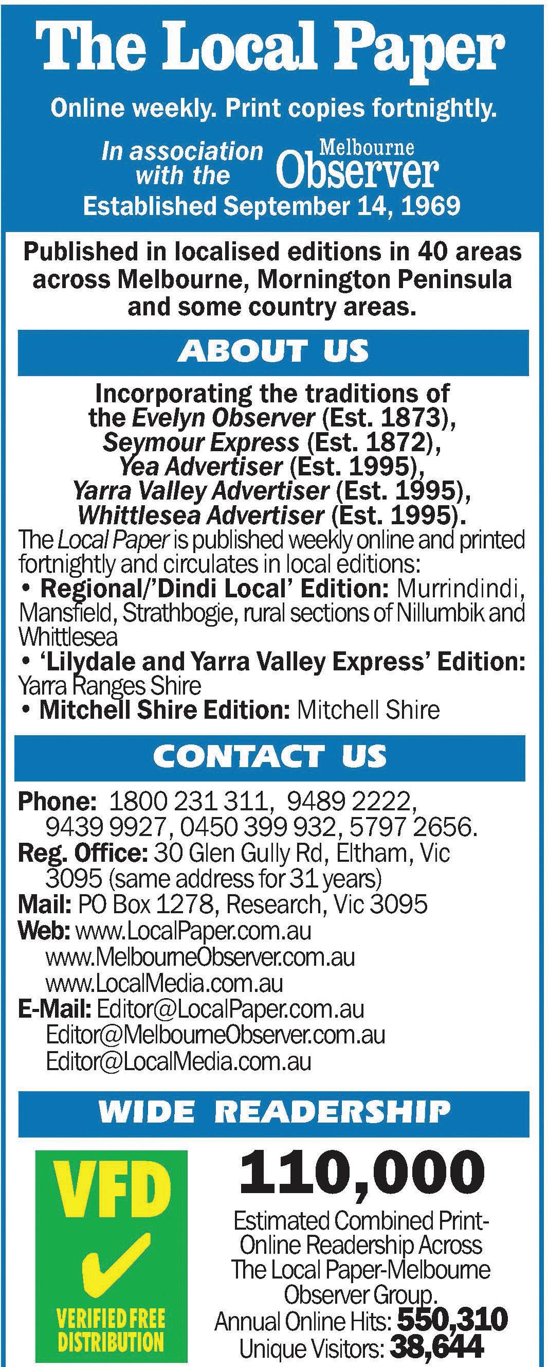 Public notices, employment ads, pages with news of Council activities. Does your local Council publish ads in The Local Paper? Does your local Council practice what it preaches about transparency and clarity?The Local Paper has a network of local editions - in print and online - that serve local communities including Banyule, Bayside, Boroondara, Brimbank, Cardinia, Casey, Darebin, Frankston, Glen Eira, Greater Dande-nong, Hobsons Bay, Hume, Kingston, Knox, Manningham, Mans-field, Maribyrnong, Maroondah, Melbourne, Melton, Merri-bek, Mitchell, Monash, Moonee Valley, Moor-abool, Mornington Penin- sula, Murrindindi, Nillumbik, Port Phillip, Stonnington, Strath-bogie, Whitehorse, Whittlesea, Yarra and Yarra Ranges. Does your local Council advertise locally? Does it hide its ads in the daily newspapers - at unnecessary ex- pense?Smart Councils use The Local Paper to best serve local people.