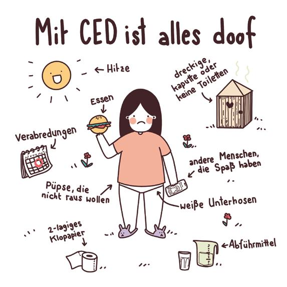 „Ach du Scheiße!“ – das waren die Wörter, die Kirsten Schneider herausgerutscht sind, nachdem sie ihre Diagnose Morbus Crohn erhalten hat. Da sie selbst erst einmal auf die Suche nach Informationen zu ihrer Erkrankung gehen musste, hat sie sich entschieden, zusammen mit dem Verein CHRONISCH GLÜCKLICH e. V. ein Buch zu schreiben – um frisch diagnostizierten Betroffenen eine lebensnahe Hilfe an die Hand zu geben. Dabei geht Kirsten auf viele verschiedene Fragen ein, die Betroffene umtreiben, und nimmt dabei kein Blatt vor den Mund. Ihre wunderbaren Illustrationen machen dieses Buch zu einem sehr informativen und lebensnahen Begleiter, der immer versucht, CEDPatient*innen zu zeigen, wie das Leben trotz Erkrankung gelingen kann und wo man Hilfe findet – nicht zuletzt im Austausch mit anderen Betroffenen, den Bauchfreunden, von denen auch einige im Buch vorgestellt werden.