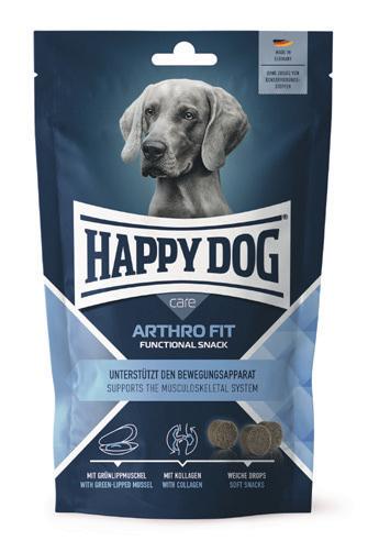Die Gelenke unserer vierbeinigen Freunde werden zwangsläufig tagtäglich Belastungen ausgesetzt, egal ob beim Spielen und Toben oder beim Hundesport. Um die natürliche Funktionalität der Gelenke zu unterstützen, wurde der neue Happy Dog Care Snack Arthro Fit entwickelt. Der Snack ist nicht nur besonders schmackhaft, sondern sorgt mit wertvoller Grünlippmuschel und Kollagenhydrolisat für eine zusätzliche Unterstützung des Bewegungsapparates. Die weichen Drops dieses funktionellen Snacks sind einfach in der Handhabung und perfekt zu dosieren. Hergestellt in Deutschland ohne den Zusatz von Zucker und künstlichen Aroma-, Farb- und Konservierungsstoffen. Erhältlich im 100 g Beutel mit praktischem Wiederverschluss.
