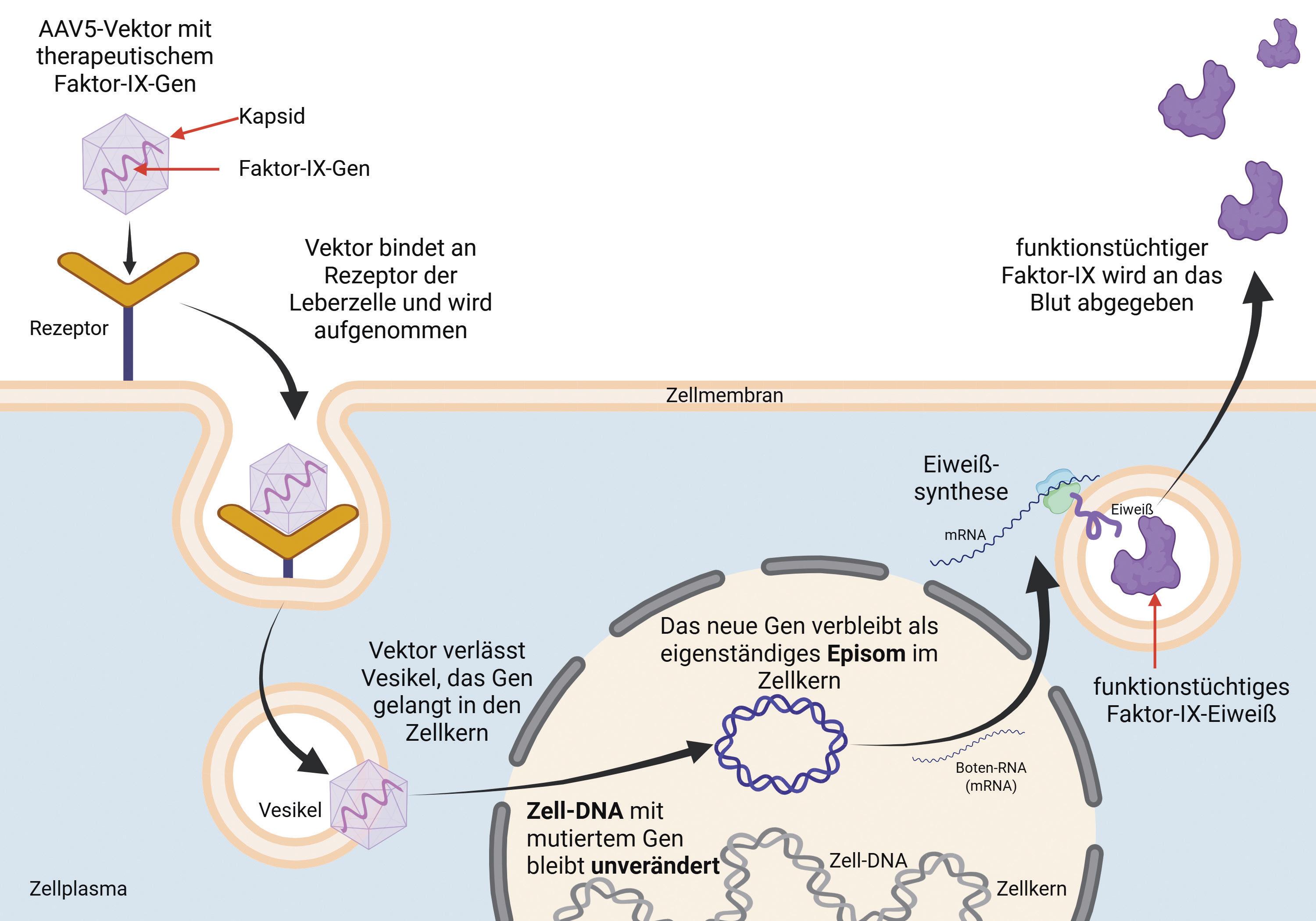 Die Gentherapie ist ein neuartiger Ansatz zur Behandlung genetischer Erkrankungen, die durch ein einzelnes defektes Gen verursacht werden – wie es bei der Hämophilie der Fall ist. Für die Durchführung wird ein funktionsfähiges Gen in den Körper eingeschleust, um das fehlerhafte Gen zu ersetzen. Hierfür wird ein Transportmittel benötigt: Das funktionsfähige Gen wird in sogenannte Vektoren verpackt, die das Gen auf der Reise in die Körperzellen schützen und zum Ziel leiten, den Leberzellen, da der Körper dort die Gerinnungsfaktoren bildet. Vektoren nutzen die biotechnologisch hergestellten "Verpackungen" von Viren, deren genetisches Material jedoch ersetzt wurde. Sie sind nicht mehr vermehrungfähig und lösen keine Infektionskrankheit mehr aus. Da die Leber der Ort der Bildung der