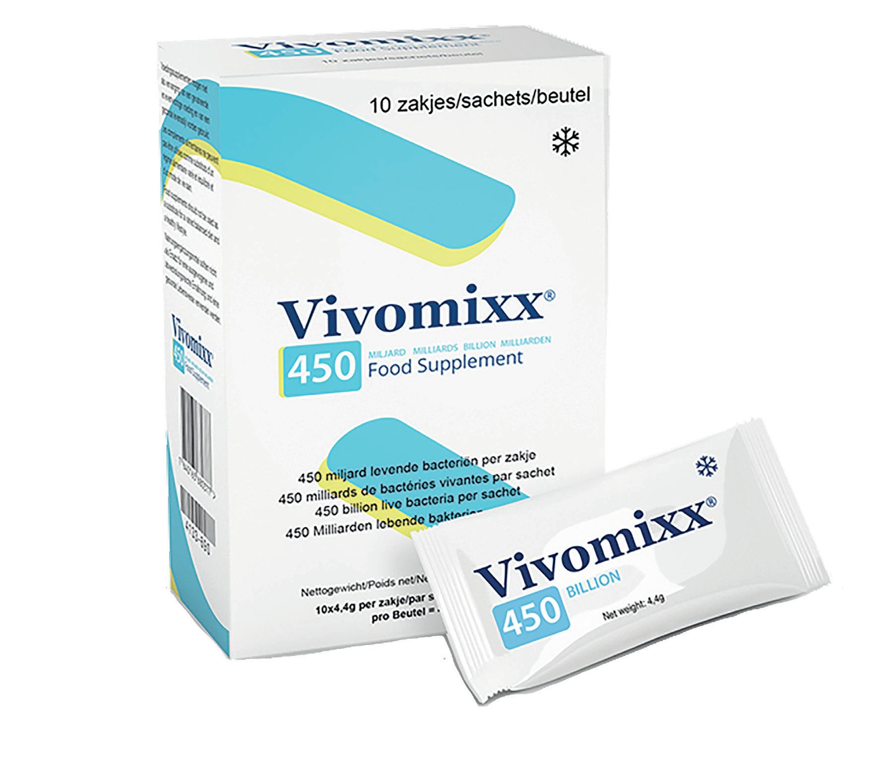 8 stammen, 450 miljard levende bacteriën Vivomixx® is een microbiotisch voedingssupplement met sterke potentie en bevat 8 stammen van levende bacteriën, in concentraties van 450 miljard bacteriën per zakje en 112 miljard per capsule.