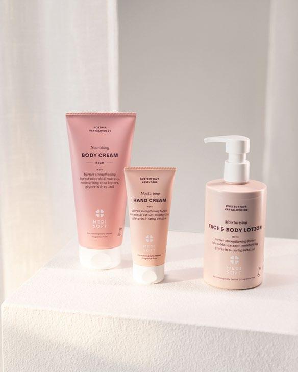 Suomessa valmistettavat ihon suojakerrosta vahvistavat Medisoft-voiteet sisältävät innovatiivista Re-Connecting Nature™ –metsämikrobiuutetta, ja ne soveltuvat koko perheen ihon hoitoon. Tutustu yhteistyössä Allergia-, iho- ja astmaliiton kanssa kehitettyyn Medisoftihonhoitosarjaan: yliopistonapteekki.fi/tuotemerkit/ medisoft