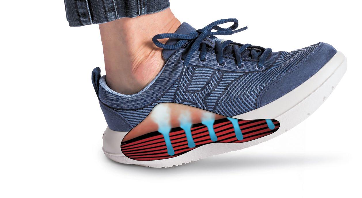 Kybun-kenkien ainutlaatuisen pohjarakenteen avulla saadaan aikaiseksi jalan luonnollinen rullaava liikerata.