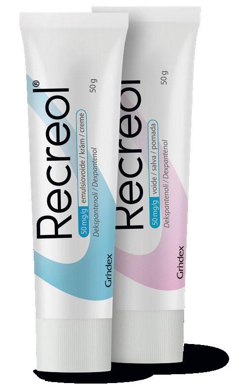 LÄÄKEVALMISTE: Recreol 50 mg/g voide ja Recreol 50 mg/g emulsiovoide: Käyttöaihe: Eri syistä aiheutuneiden pinnallisten ihovaurioiden tukihoito epidermaalista estettä kosteuttamalla, epitelisoitumista tukemalla ja sen jälkeen tulehdusta ja kutinaa hillitsemällä. Vaikuttava aine: dekspantenoli. Annostus: Jollei muuta ohjetta ole annettu, Recreol-voidetta tai -emulsiovoidetta levitetään ohuelti aikuisten ja lasten hoidettavalle ihoalueelle kerran tai useita kertoja päivässä. Älä käytä: Jos olet yliherkkä jollekin tuotteen sisältämälle aineelle, tai haavoihin, jos sinulla on verenvuototauti. Voiteen ja emulsiovoiteen käyttö raskauden ja imetyksen aikana vain lääkärin ohjeen mukaan. Varoitukset ja varotoimet: Recreol-voiteen tai -emulsiovoiteen joutumista silmiin pitää välttää. Yliherkkyysoireiden ilmetessä Recreol-voiteen tai -emulsiovoiteen käyttö pitää lopettaa ja yhteys lääkäriin otettava, ellei olosi parane tai se huononee. Recreol-voide sisältää parafiinia, joten syttymisriskin takia tupakointia ja avotulen lähellä oleskelua voiteen käytön aikana tulee välttää. Tutustu huolellisesti pakkausselosteeseen. Grindeks Kalceks Suomi Oy 09/2025, GK02092025