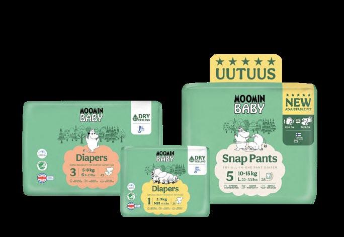 – Moomin Baby -vaipoissa selluloosa on peräisin FSC-sertifioiduista metsistä ja valkaistu täysin kloorittomasti hapella. Raaka-aineiden valinnassa tarkastelemme sekä turvallisuutta että sitä, miten materiaalit toimivat yhdessä vaipan rakenteessa.