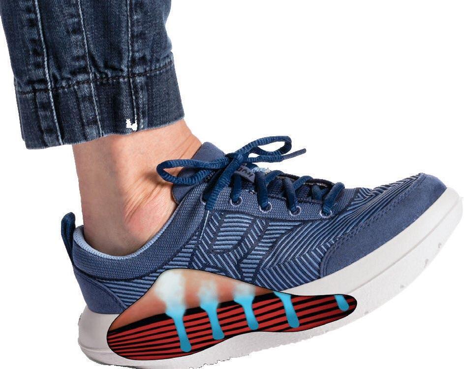 Sen lisäksi, että lukemattomista pienistä ilmakuplista koostuva ilmatyynypohja tuntuu mukavalta jalassa ja edistää jalan terveyttä, kenkä myös ohjaa jalan asentoa parempaan askeleeseen. Jalkoja hellivät kengät lievittävät niin ikään monia tuki- ja liikuntaelinvaivoja, joiden perimmäinen syy on jaloissa.