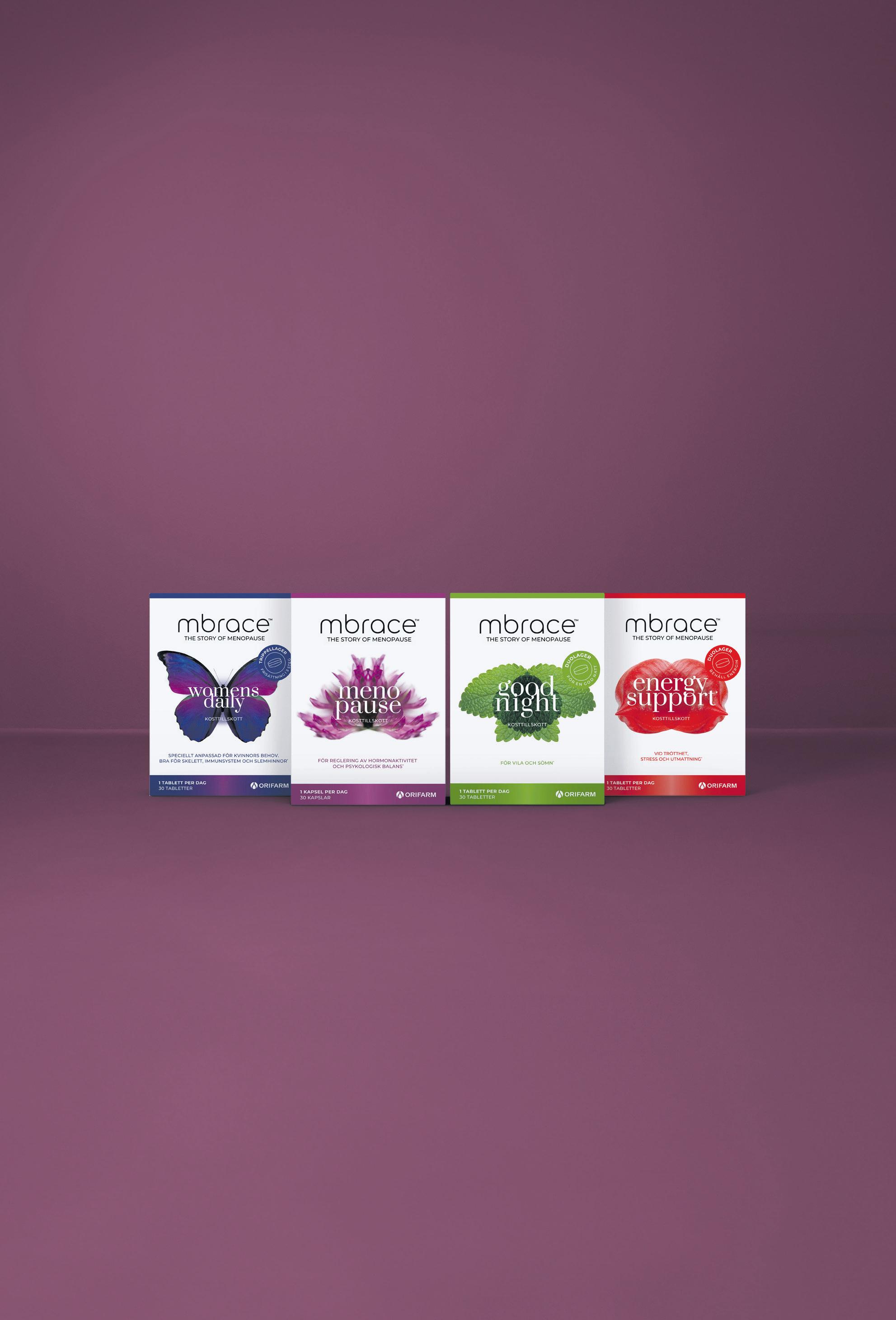 MbraceTM är en ny och unik serie kosttillskott specifikt framtagen för kvinnor inför och under klimakteriet. Varje produkt är utvecklad för att möta några av de utmaningar kvinnor upplever under denna tid i livet.
