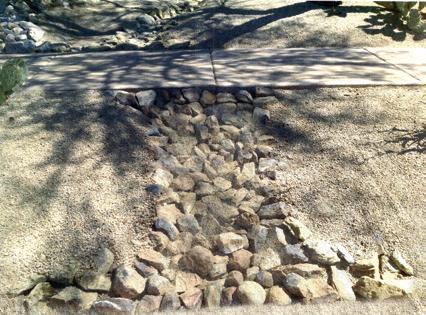 Rip rap is an archi tectural rock land scape formation placed without grouting to limit erosion and water flow. If home owners wish to install the natural drainage system, they should blend the stone with appropriate vegetation and color to match their top dressing. The stones should not be piled on the ground, but instead inserted into the soil sparingly so that the appearance is 50 percent soil and 50 percent visible fieldstone. To ensure that rip rap is properly installed, please contact Community Inspector Kenny Martin at kenny.martin@dcranchinc.com or 480.419.5307.