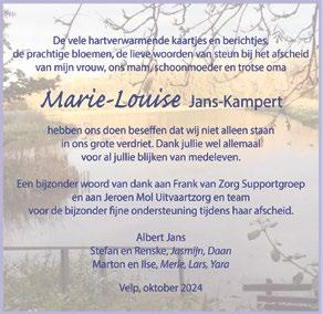 SCHAIJK - Op zondag 13 oktober vieren Ma rinus (94) en Jo (91) Raaijmakers-van Gaal uit Schaijk hun briljanten huwelijk. Het echtpaar ontmoette elkaar op de kermis in Nistelrode en is nu 65 jaar getrouwd. Marinus, geboren in Nis telrode, werkte als metselaar, terwijl Jo, geboren in Schaijk, zorgde voor hun vijf kinderen – één dochter en vier zonen – en voor haar ouders. Het echtpaar is daarnaast de trotse opa en oma van zeven kleinkinderen en vijf achterkleinkinderen.