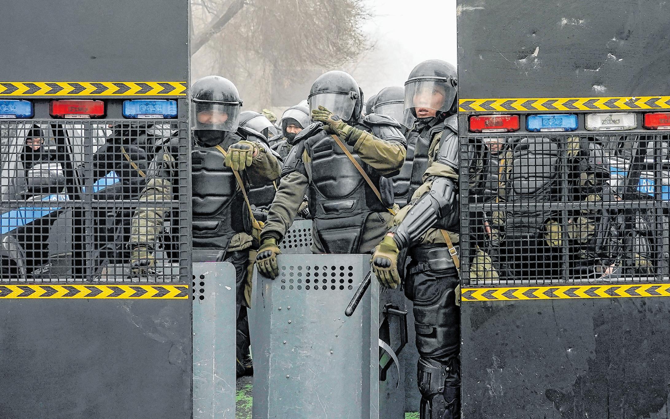 Rohamrendőrök barikádot emeltek egy utcán, hogy feltartóztassák a tüntetőket Almati központjában 2022. január 5-én. A kazahsztáni tiltakozások január 2-án kezdődtek Zsanaozen városban. A zavargások átterjedtek az ország több városára Fotó: MTI/EPA