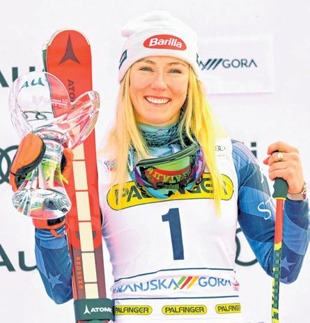A győztes amerikai Mikaela Shiffrin az eredményhirdetésen a női alpesi sízők világkupa-sorozatának a szlovéniai Kranjska Gorában rendezett óriás-műlesikló versenye után vasárnap.