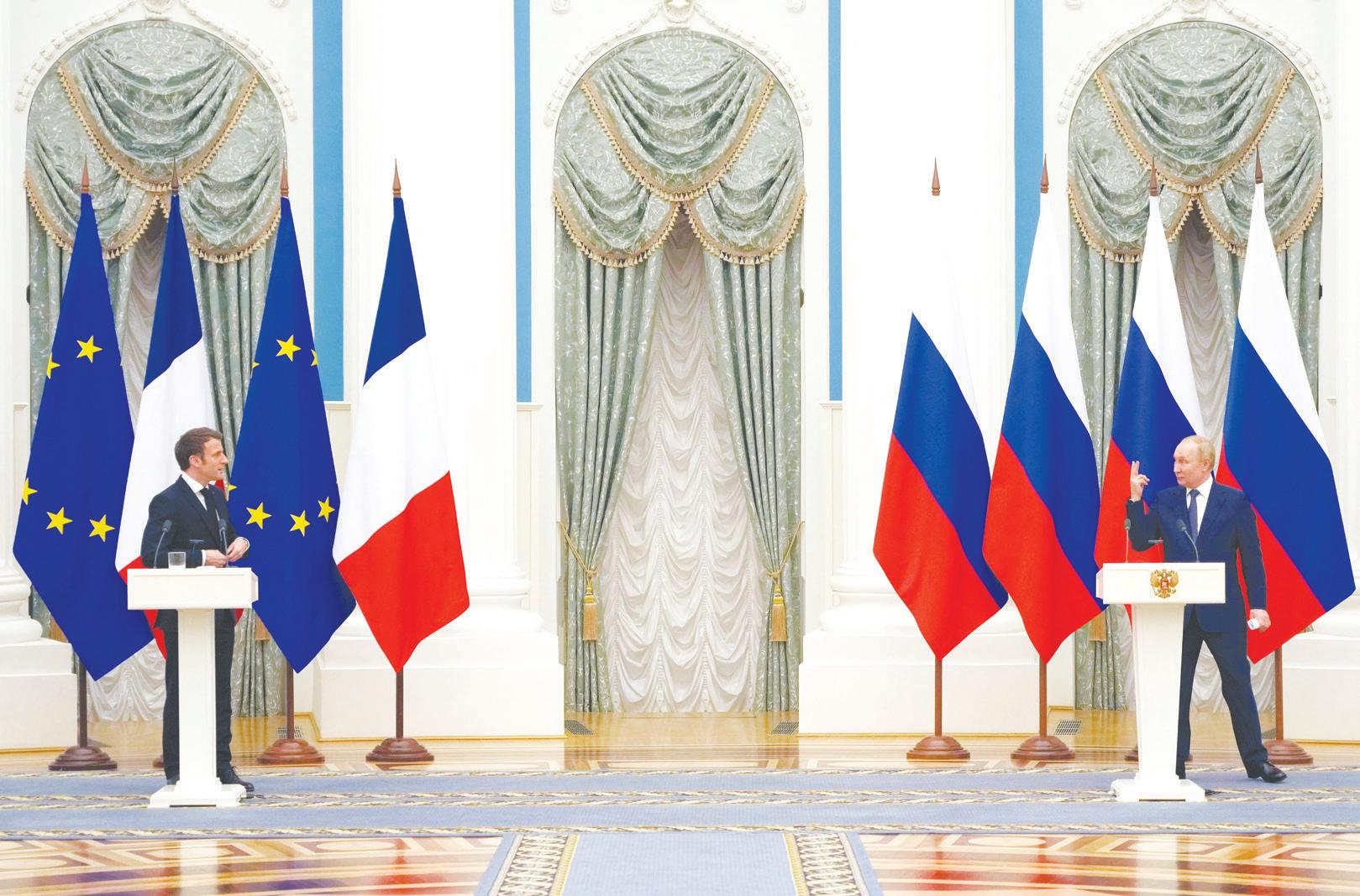 Emmanuel Macron francia elnök és Vlagyimir Putyin orosz elnök sajtóértekezletet tart tárgyalásuk után a moszkvai Kremlben 2022. február 7-én Fotó: MTI/AP Pool/Thibault Camus