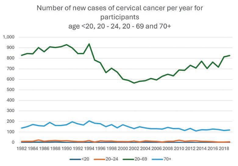 From 1982 to 2019 the number of new cervical cancer cases annually has reduced to approximately 100 cases in the 70+ age cohort. Screening this cohort would detect additional cases of cervical cancer that would otherwise present at a late stage.