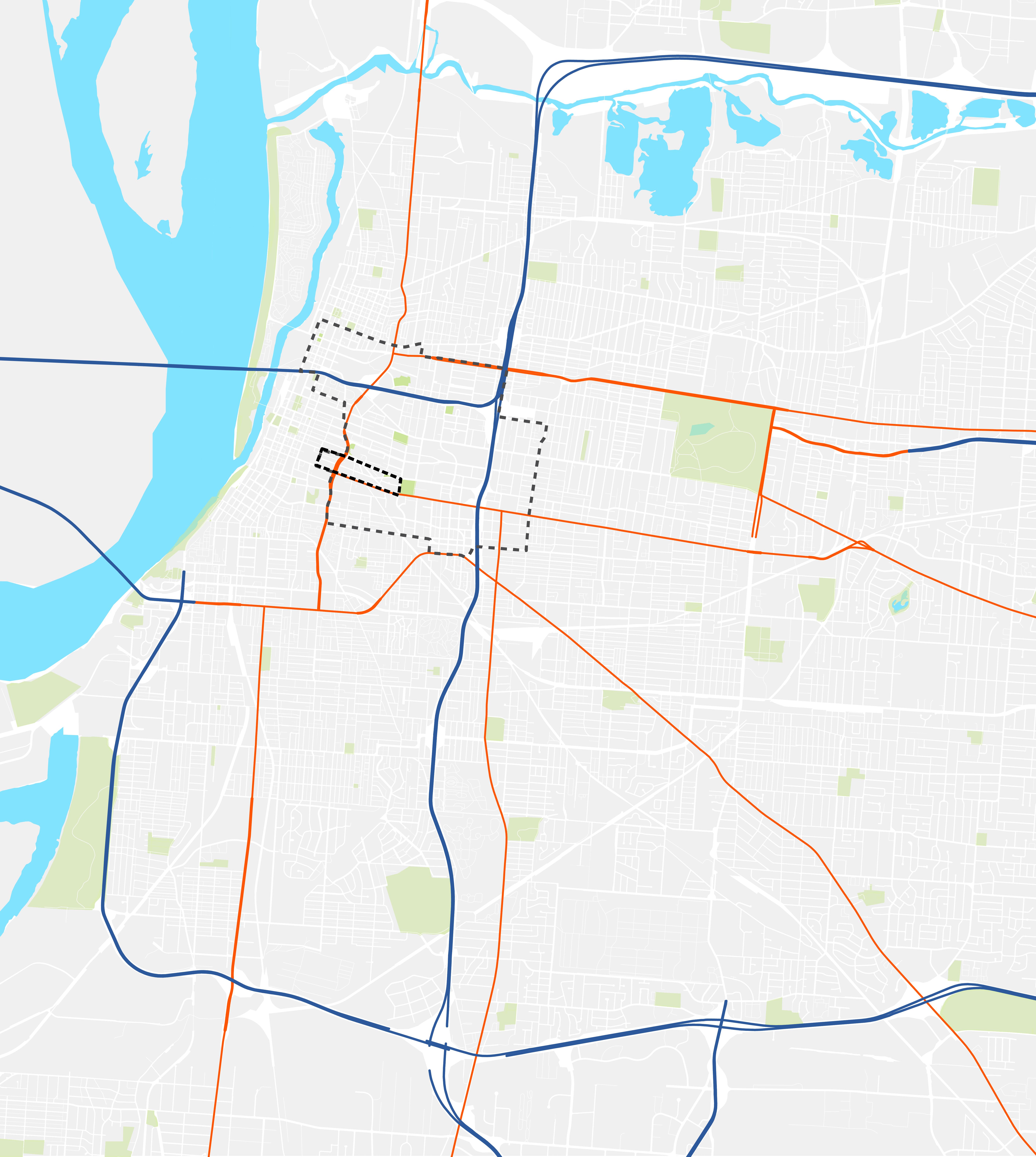 Daily traffic counts data indicate that most commuters are entering the district by way of Interstate 40, Interstate 69 and Union Ave.