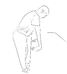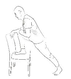 Sådan gør du: Stil dig op og lad din stol stå fast mod væggen, så den ikke glider (du kan også bruge en skuffe eller et bord). Stå med en afstand til stolen. Sæt den ene fod op. Læn nu frem fra lysken, stå her og træk vejret dybt og roligt nogle gange.