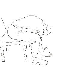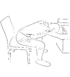 Sådan gør du: Sid lidt fremme på din stol med afstand til bordet. Læg underarmene på bordet og lad din overkrop synke ned mod gulvet med hovedet ned mellem armene. Tænk især på at strække området mellem dine skulderblade. Træk vejret dybt og roligt flere gange.