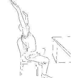 Sådan gør du: Sæt dig fremme på stolen, som sad du på en hest. Lad nu hele overkroppen synke ned mellem knæene mod gulvet. Slap godt af i nakken, i kæberne, i skuldrene og ryggen. Træk vejret og se, om du kan slappe endnu mere af end før. Langsomt ’stabler’ du ryggen op igen og sidder lidt. Derefter kan du fortsætte med at strække begge armene op over hovedet. Måske får du behov for at gabe, og så gaber du helt igennem.