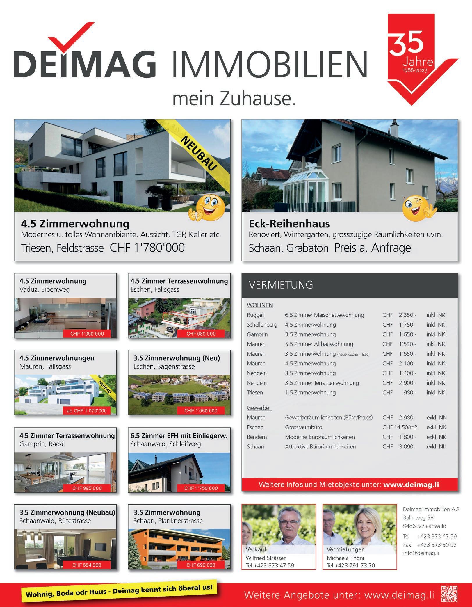 Verleger: Zeit-Verlag Anstalt, Essanestrasse 116, 9492 Eschen, +423 375 9000 · Redaktion: Herbert Oehri (Redaktionsleiter), Johannes Kaiser, Vera Oehri-Kindle, Heribert Beck · Beiträge/InterviewpartnerInnen: Herbert Elkuch, Regierungschef Daniel Risch, Markus Sprenger, Cornelius Goop, Sabine Moosmann, Marc Büchel, Peter Frick, Leonora De Biasi, Tilmann Schaal, Alex Biedermann, Christian Marold, Carmen Oehri, Sandra Copeland, Fabienne Ederer, Lena Hoop, Rachel Guerra, Lars Huser, JWT IMMOBILIEN AG, Christoph Kindle, Oliver Klaus, Markus Kaiser, Marius Zarn, Christian Imhof, Günther Meier, Cornelia Wolf, Carmen Foser · Grafik/Layout: Carolin Schuller, Daniela Büchel · Anzeigen: Vera Oehri-Kindle, Brigitte Hasler · Fotos: Michael Zanghellini, Pamela Bühler, Paul Trummer,