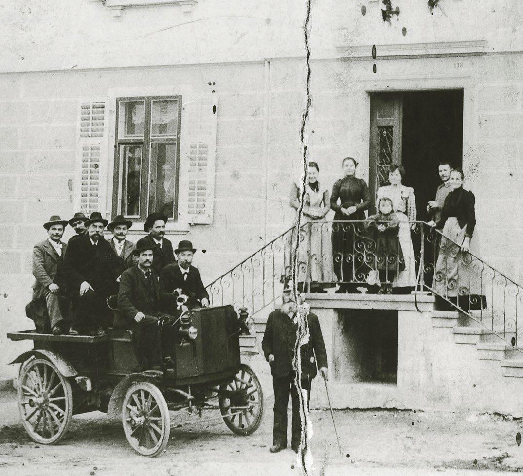 V. l.: Bierbrauer Rudolf Quaderer, Flaschner Karl Jehle, Schlosser Josef Beck, Bierbrauer Otto Quaderer, Metzger Josef Hilti, ein unbekannter Mann, Lindenwirt (1903-1906) Thadäus Beck, neben dem Auto: Bahnmeister Gottlieb Hilti, auf der Treppe: Maria Beck, Lindenwirtin Maria Beck, Elise und Alice Beck (Töchter), zwei unbekannte Personen