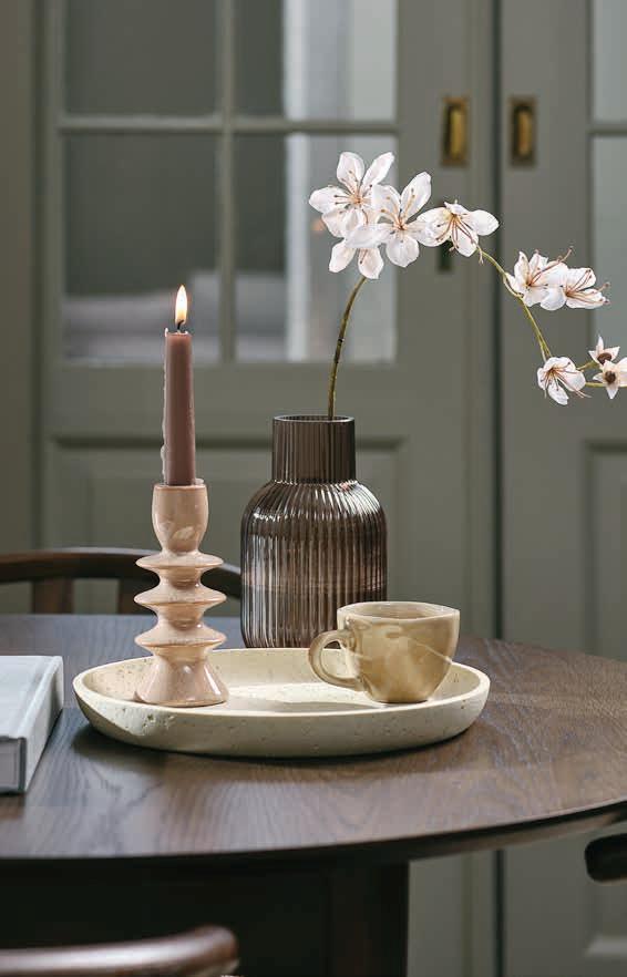 1) Kerzenständer CONRAD Irdengut. Ø8 x H16 cm 2) Vase YNGVAR Glas. Ø12 x H21 cm 3) Kunstblume OLA Polyethylen, Polyester, Stahl. B6 x H80 cm 4) Dekotablett JENSUFFE Polyresin, Sand. Ø30 x H3 cm