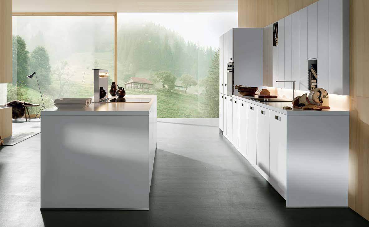 Kubisch, minimalistisch, funktional: Diese Küche mit großzügiger Insel inszeniert die Formensprache des Bauhauses auf erfrischend zeitgemäße Weise: Fronten, Arbeitsplatte und Trägerplatten in SensiQ Kristallweiß feinmatt bilden eine harmonische Einheit.